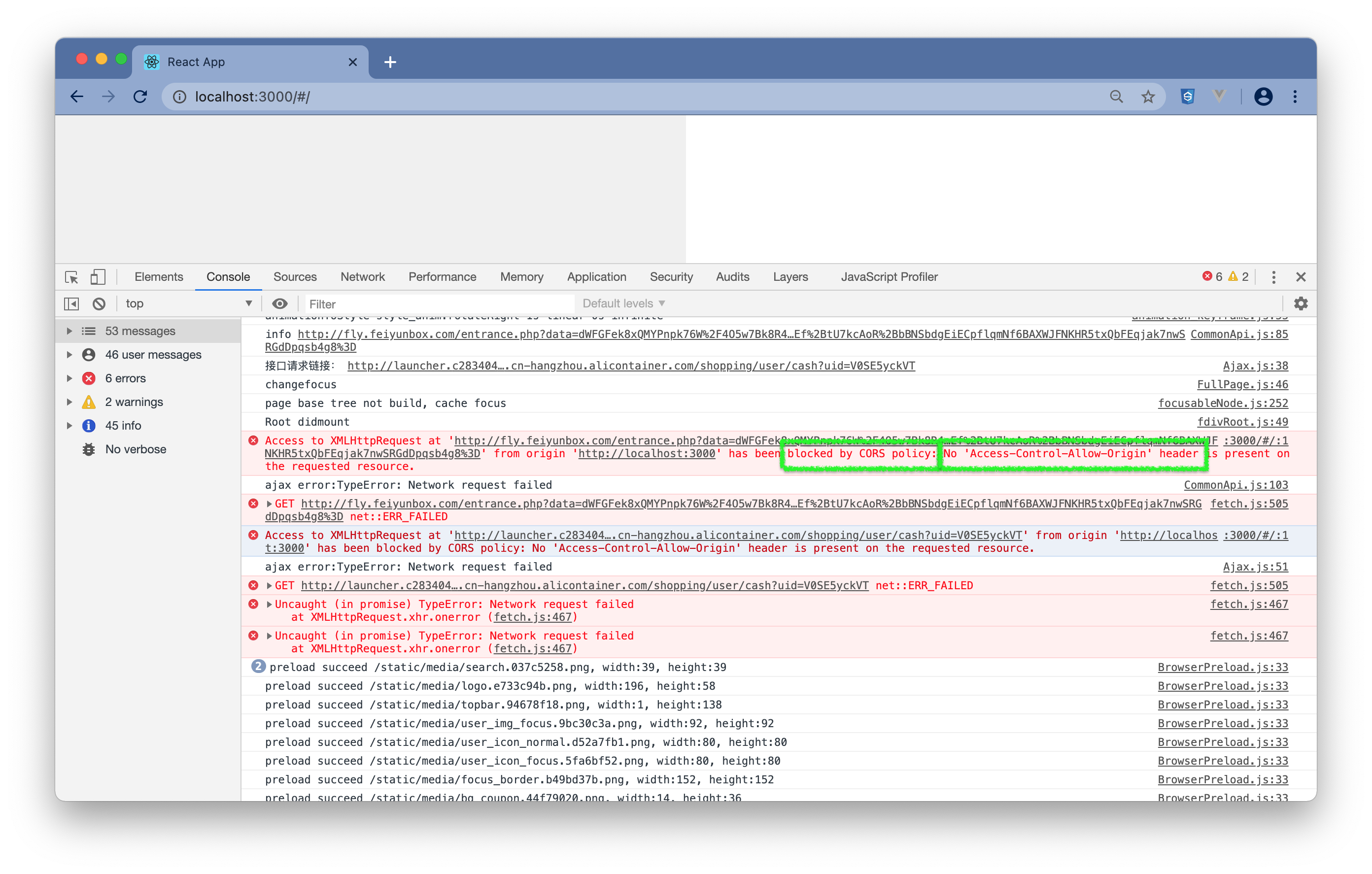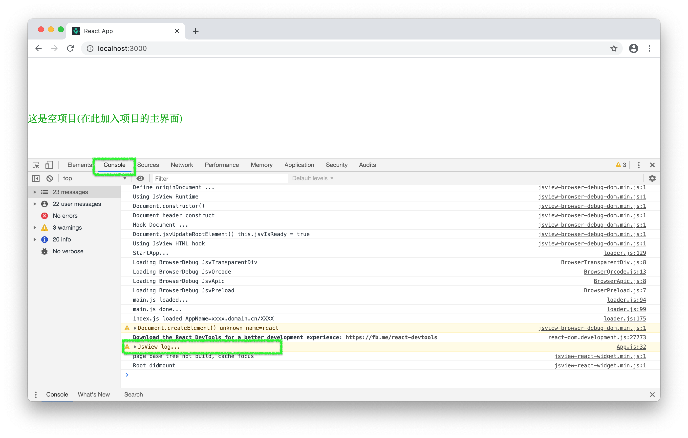 在网页端调试JsView App时,在应用到外部连接时,可能会遇到跨域问题。Console打印错误类似如图: