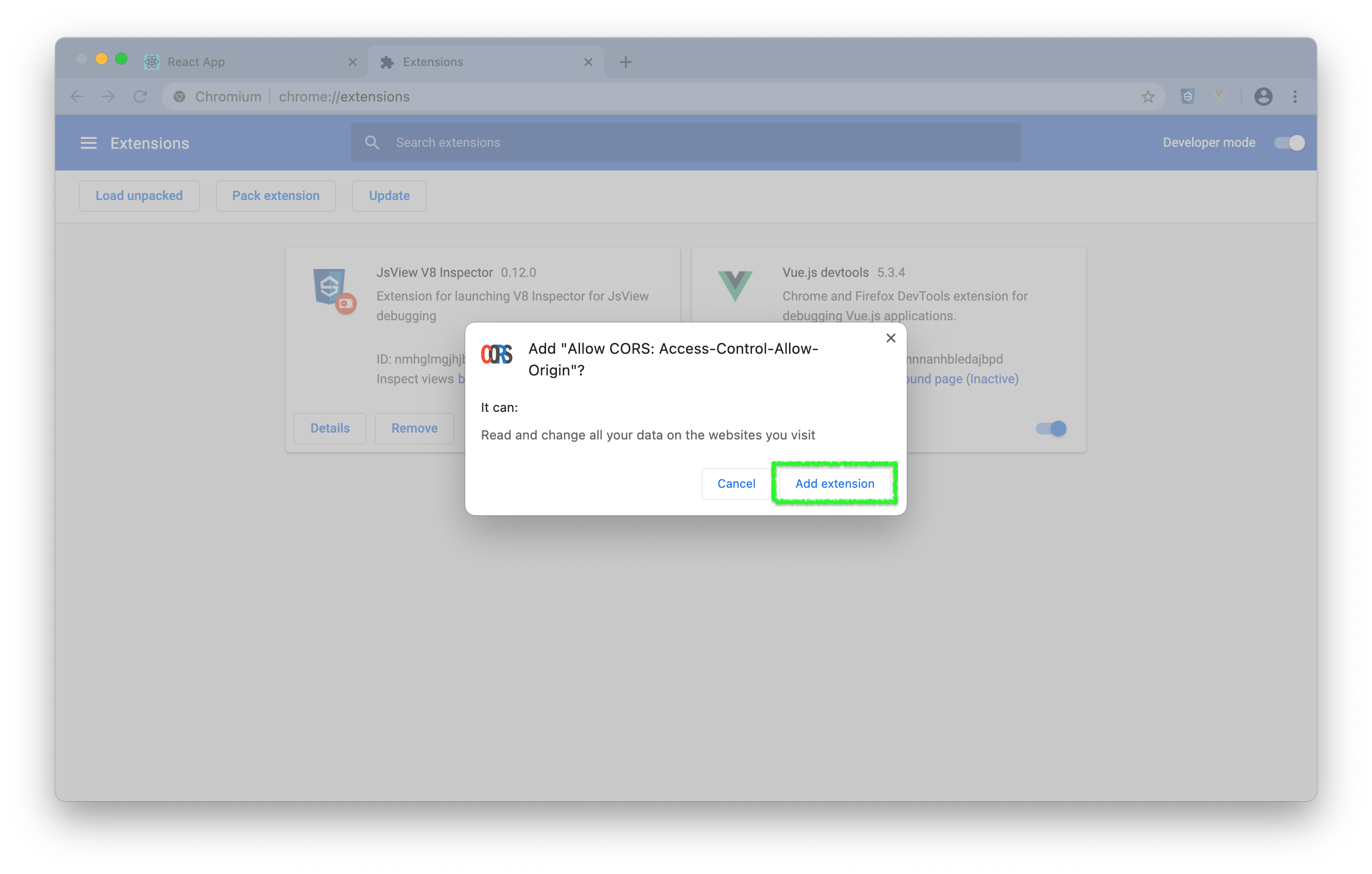 chrome://extensions/,然后拖拽Allow-CORS插件到浏览器,并选择Add extension。