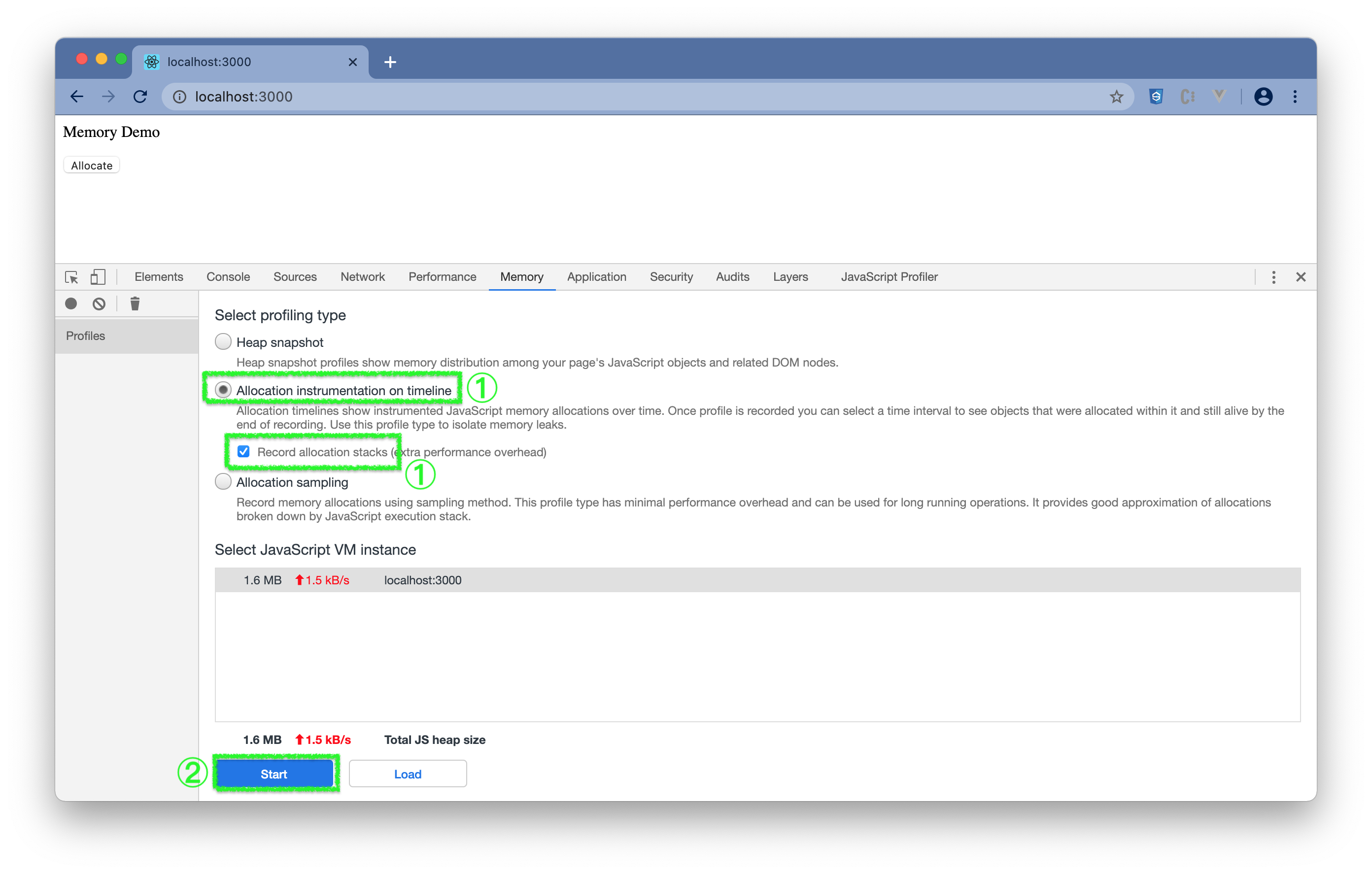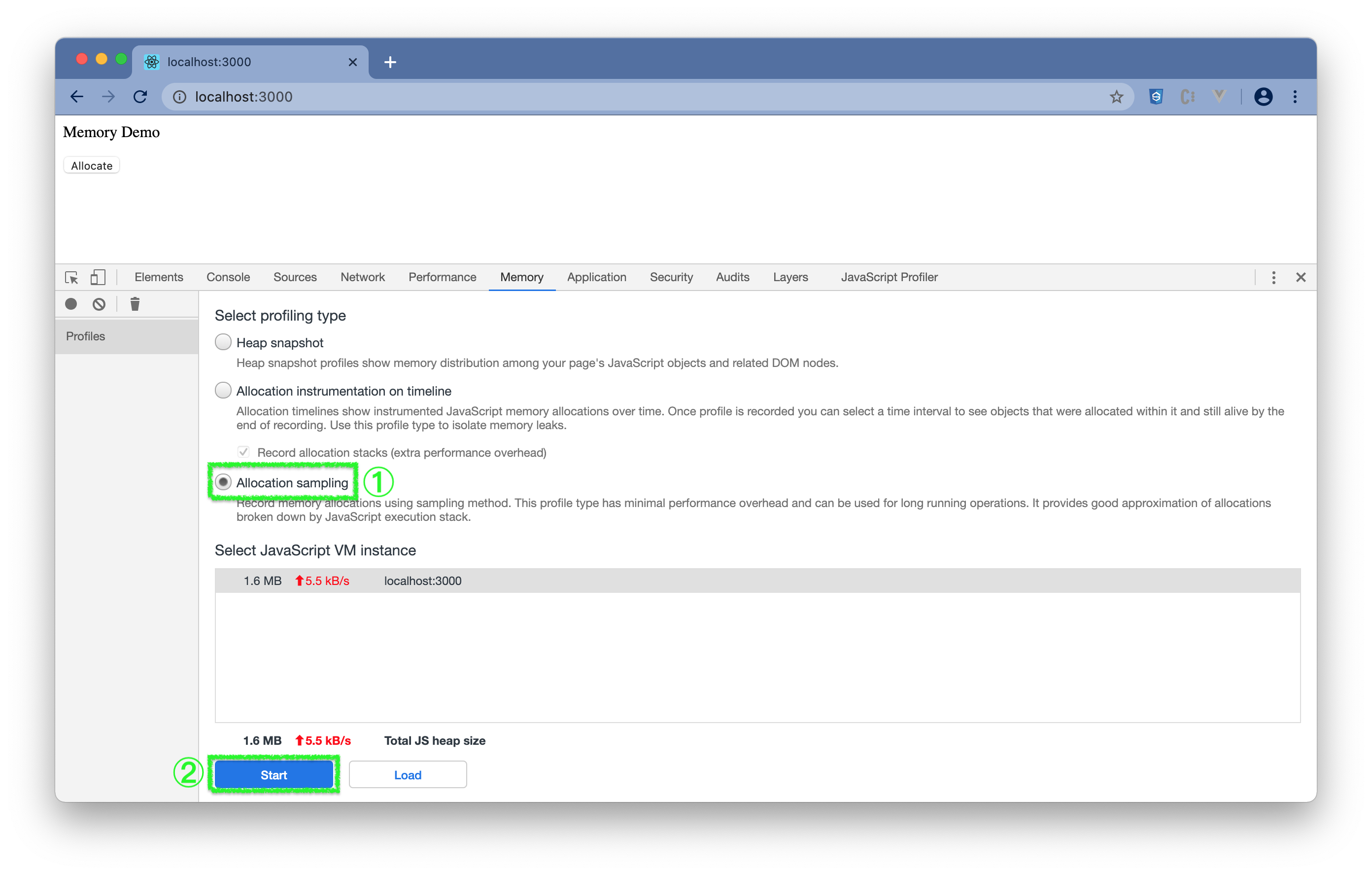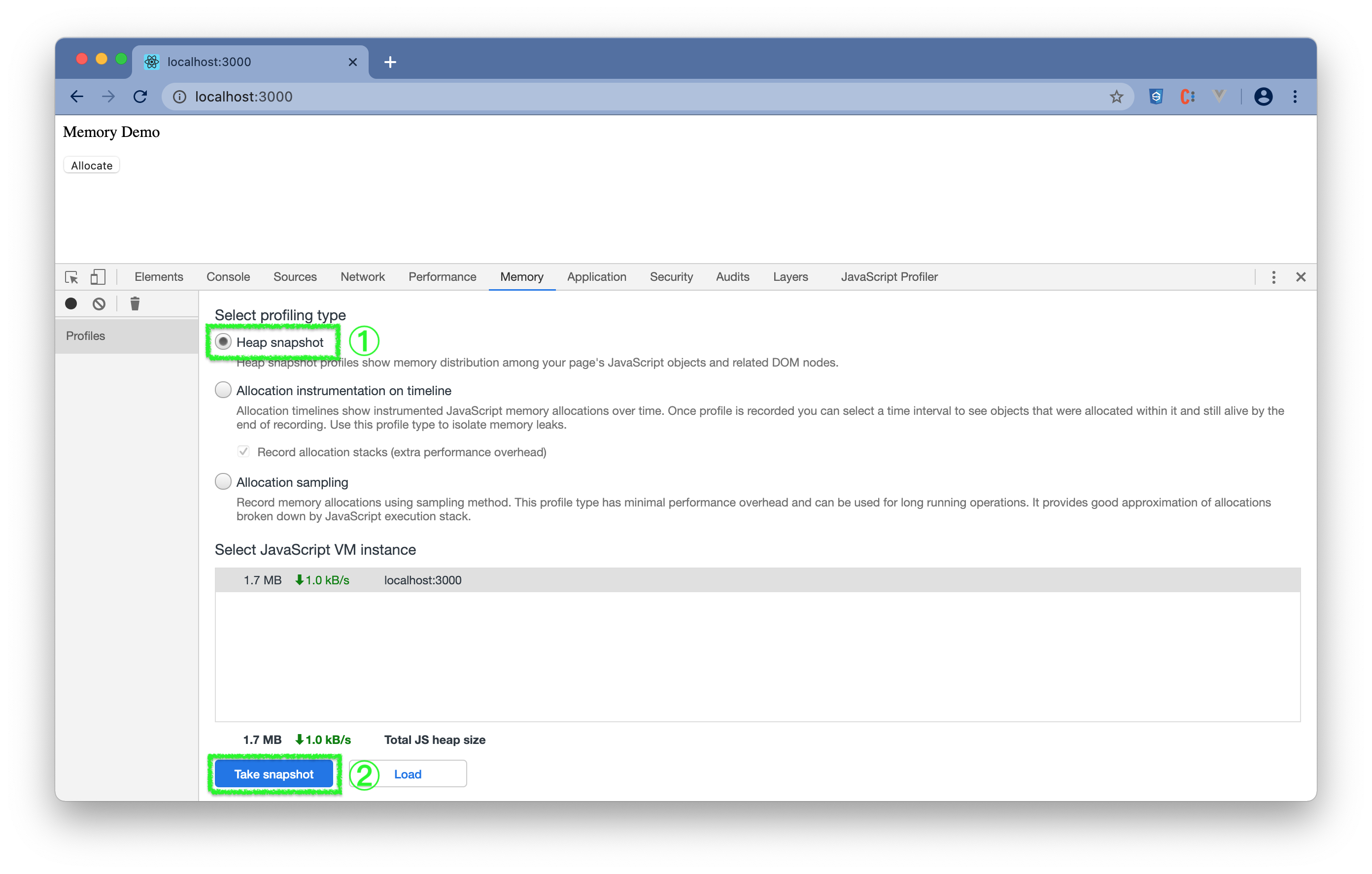 http://localhost:3000 - (3) 点击右键选择Inspect或通过"菜单 -> More Tools -> Developer Tools"打开 DevTools。(参照打开DevTools)在 DevTools 中选择"Memory"。可看到内存大概使用情况。