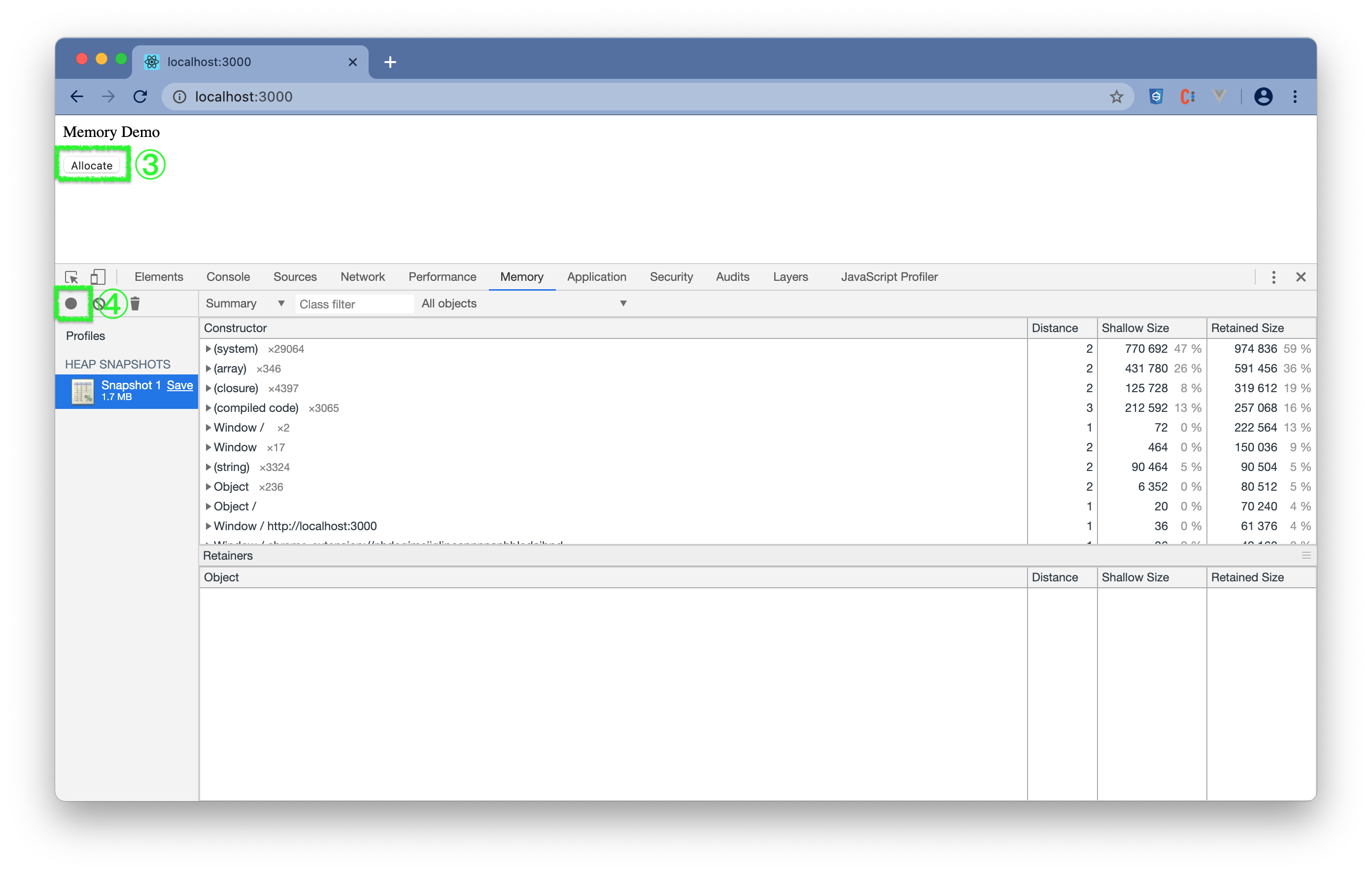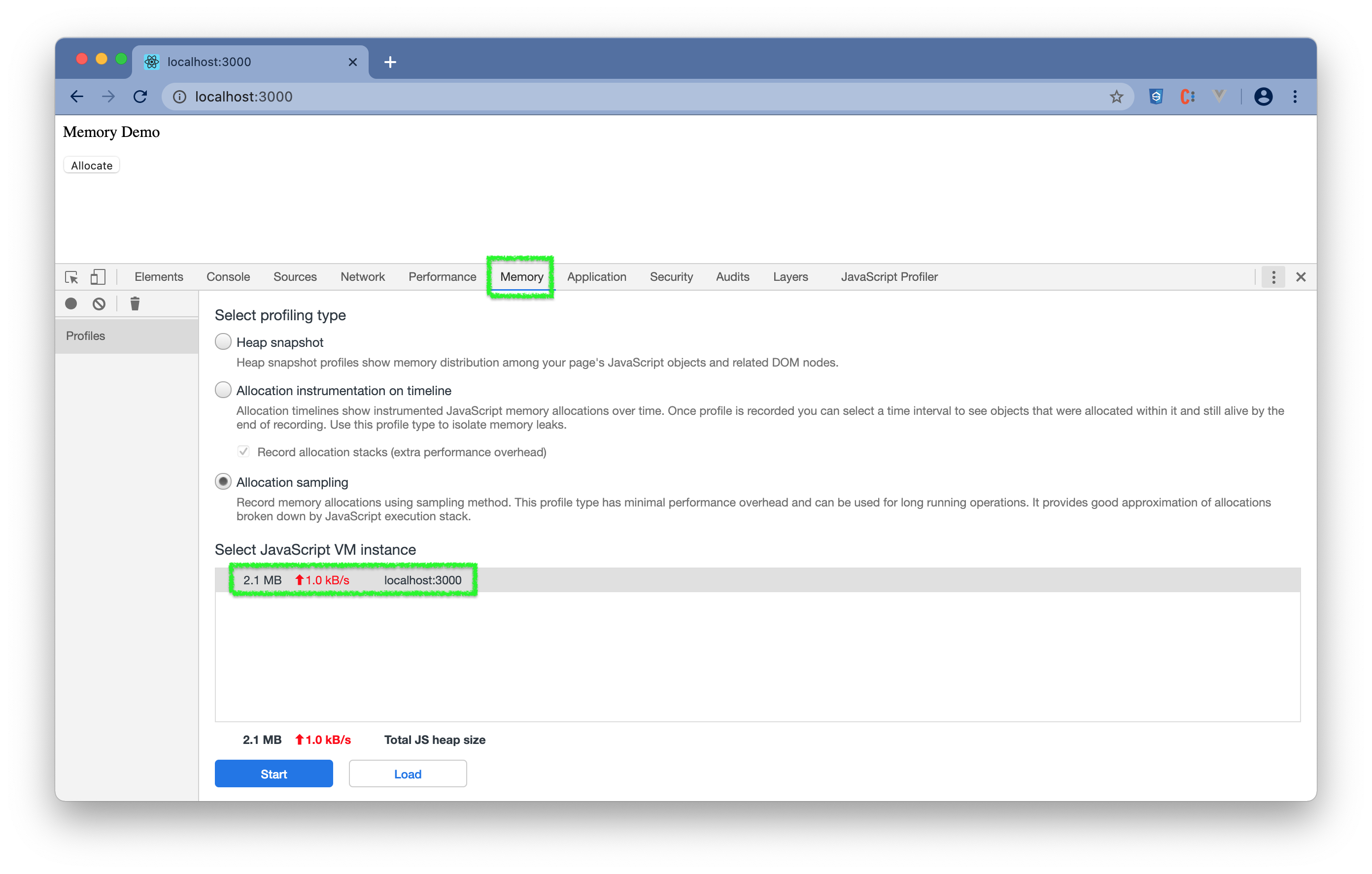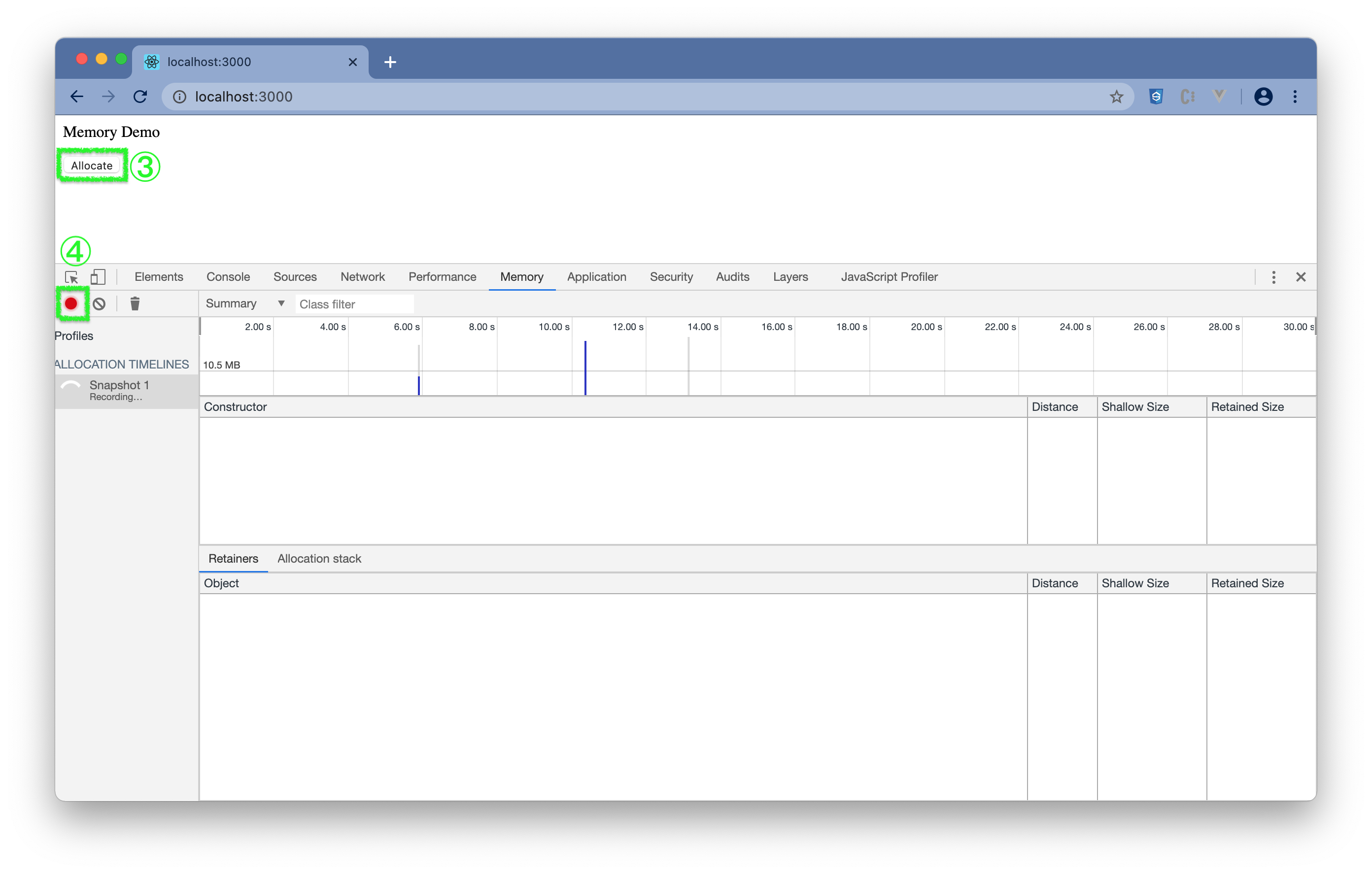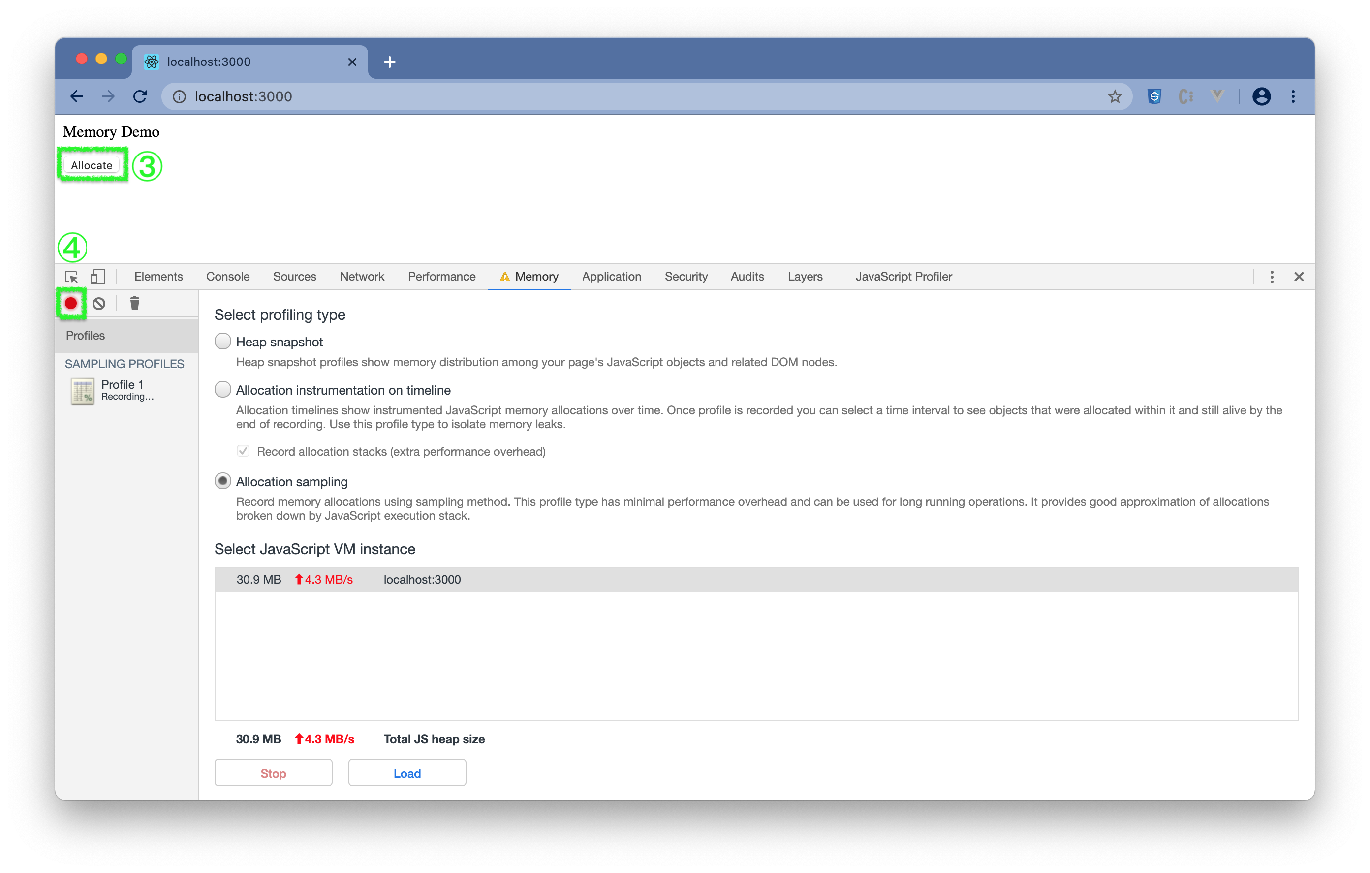 http://localhost:3000 - (3) 点击右键选择Inspect或通过"菜单 -> More Tools -> Developer Tools"打开 DevTools。(参照打开DevTools)在 DevTools 中选择"Memory"。可看到内存大概使用情况。