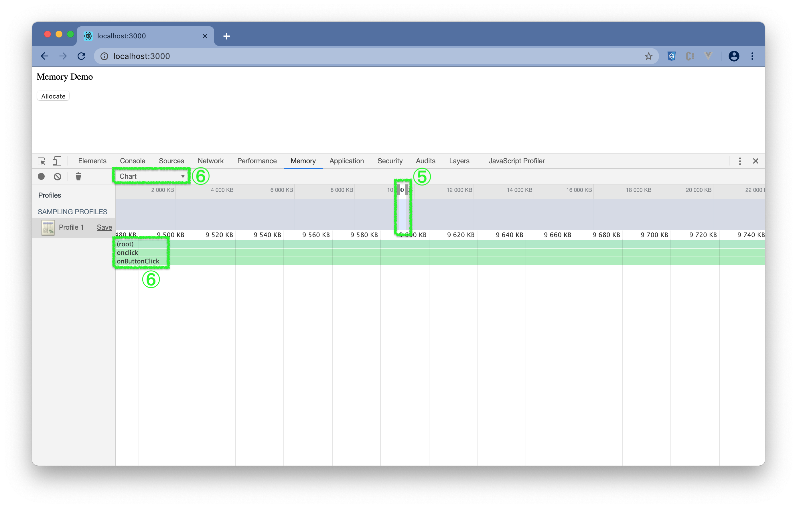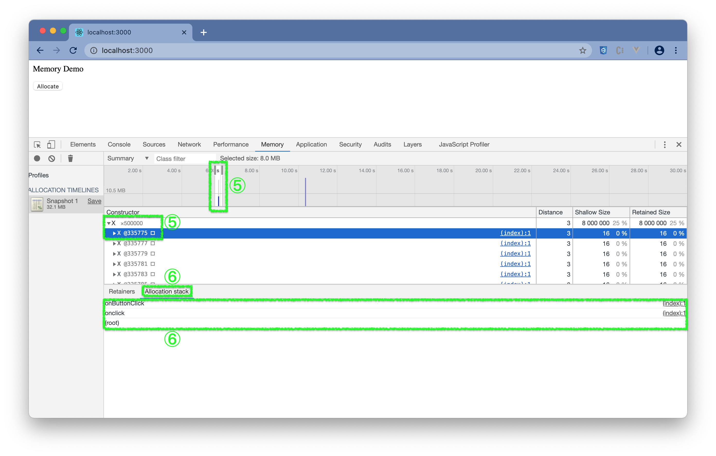 - (3) 点击页面的 Allocate 按键模拟内存增长,并等待内存增长后再点击一次。