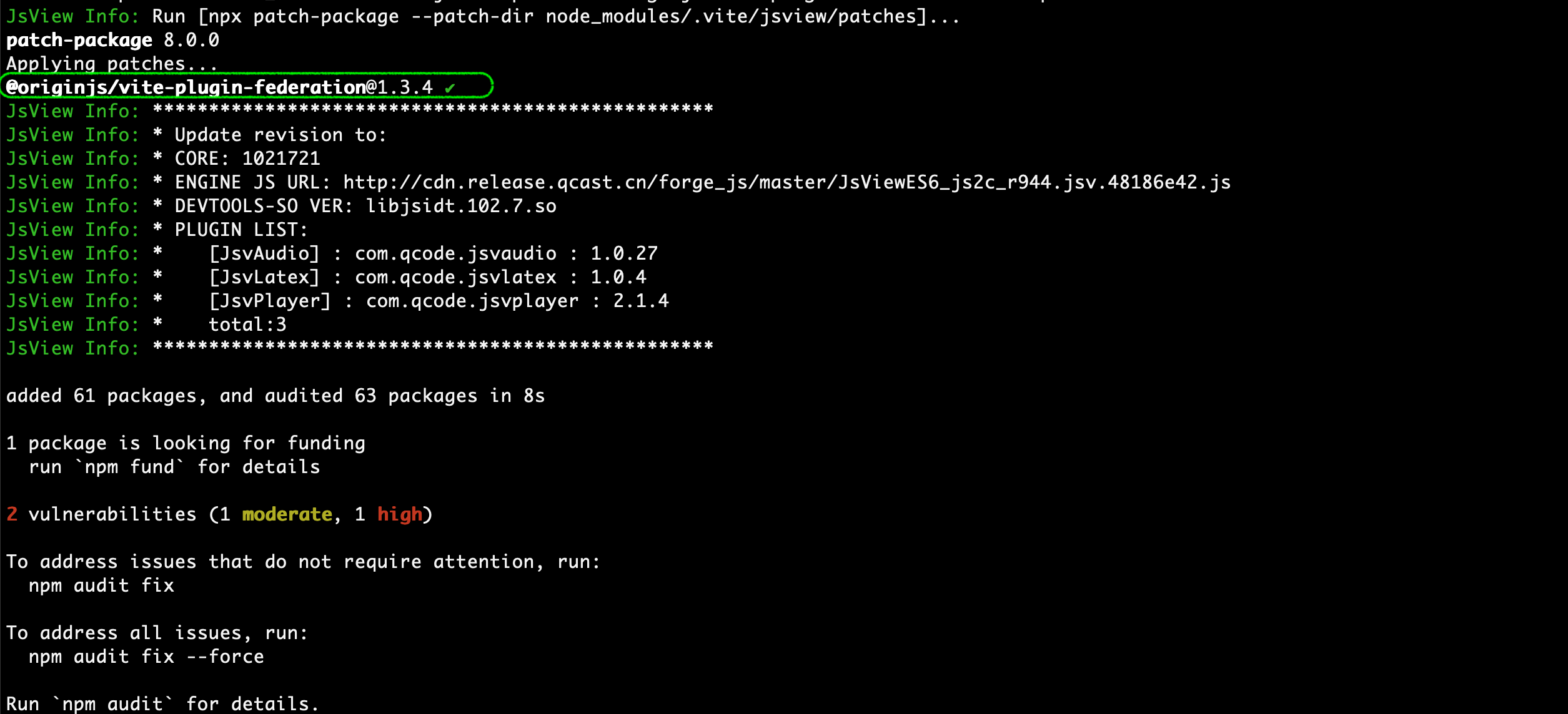 由于JsView需要对 @originjs/vite-plugin-federation 做一些源码级调整,所以需要安装指定版本 v1.3.4,其他版本暂不支持