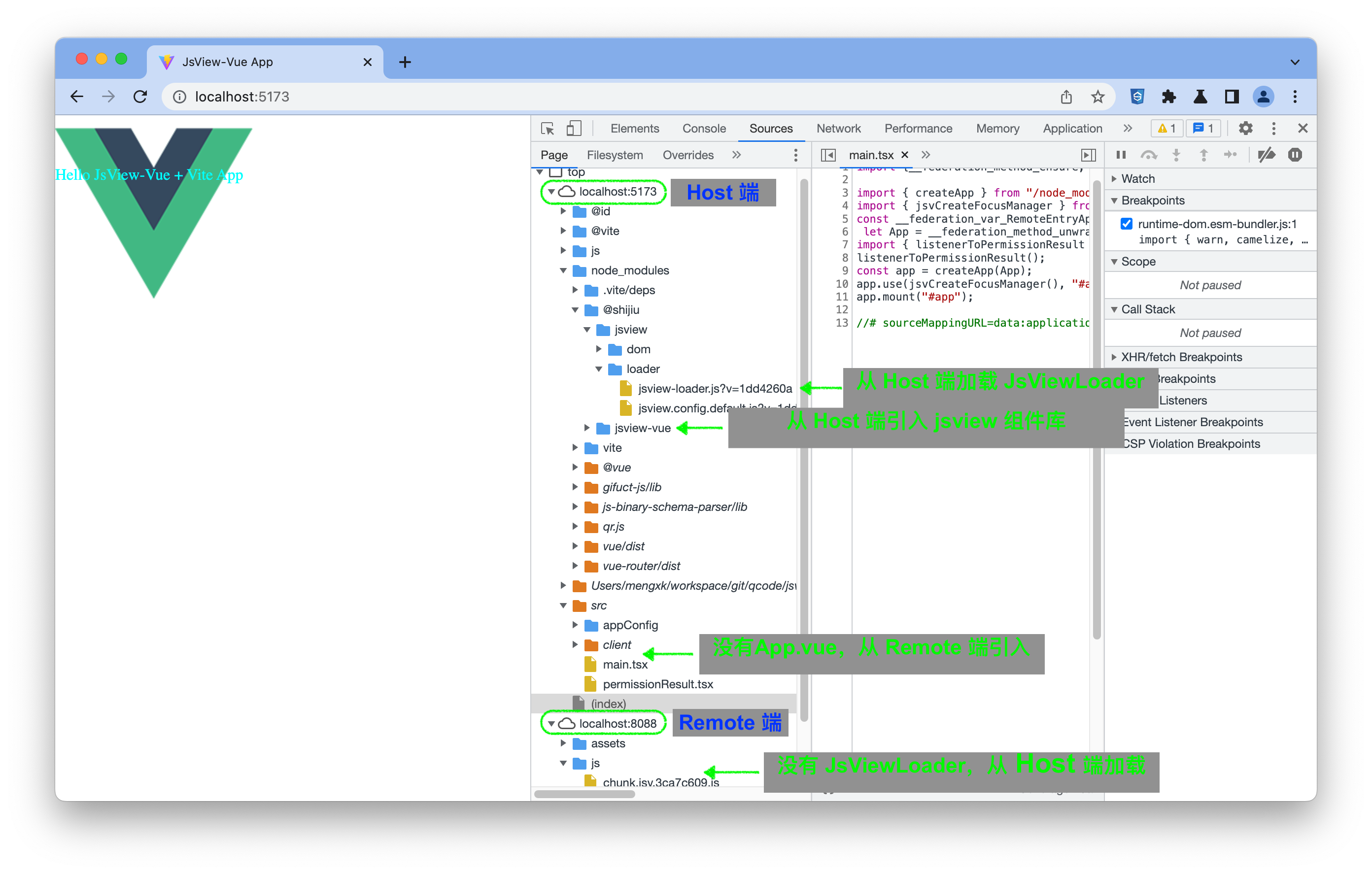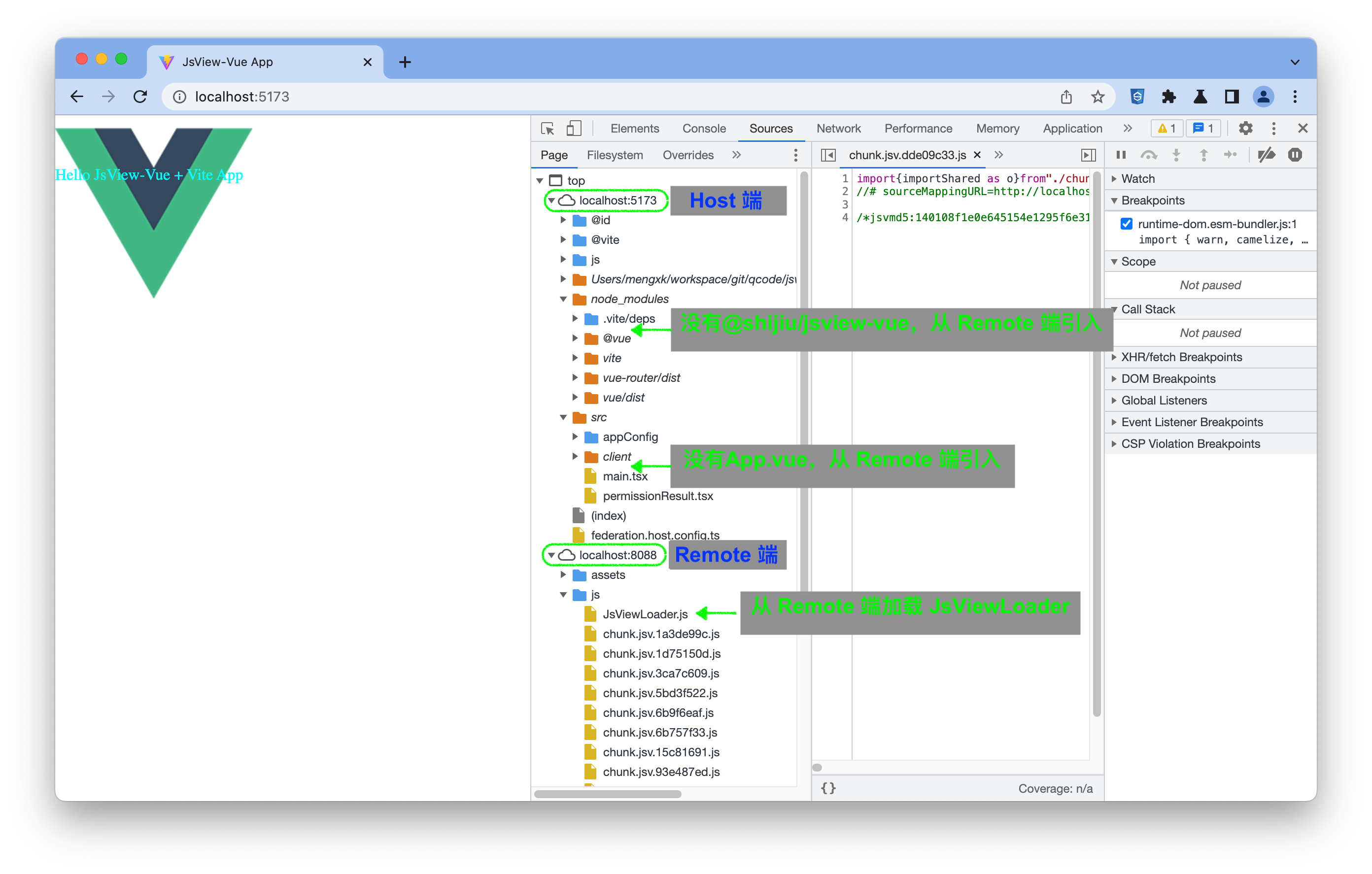 采用 expose 方式或 shared 方式的 JsView 区别在于 JsView Loader 和 JsView 组件是从 Remote 加载还是从 Host 加载,通过 DevTools 可以看出结果。